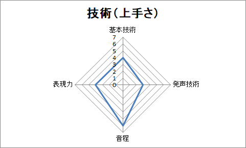 声質と声域から声区はバリトンと推測できるが、ケロロ軍曹のオープニングテーマを聴く限りは低音域にはまだまだ開発の余地があります。